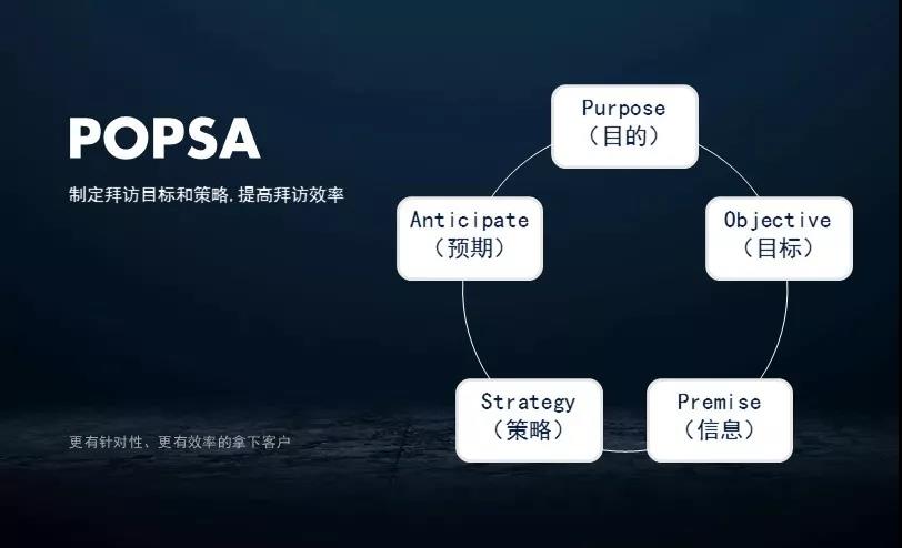 POPSA是由Purpose、Objective、Premise、Strategy、Anticipate这五个英文单词首字母组成的新单词,分别代表着目的、目标、信息、策略和预期,用来帮助销售人员提前缕清思路,做好拜访前的准备工作。