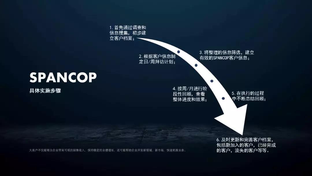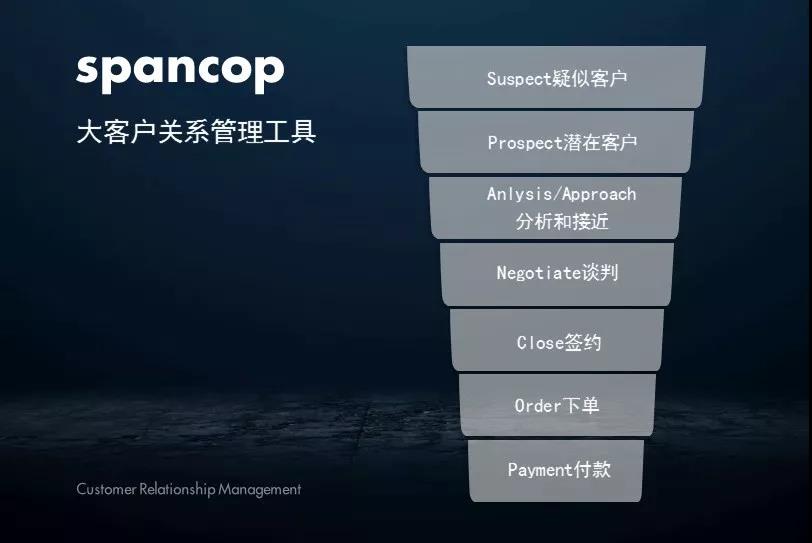 Payment(付款):对于企业而言,只有真正受到货款了才能算一个大客户开发完成,因此最后一步也是最重要的一步,要全力以赴达成交易。